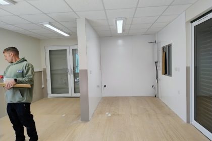 Since the start of the new year the Friend of Milton Creek have been making great progress completing the interior of Space. The walls have been insulated, studding fitted and clad with OSB and fireline plasterboard. The walls were then jointed, sanded and painted before the lower half was clad with hardwearing PVC sheeting. The electrician came in to do the first fix electrics before the suspended ceiling was fitted so the second fix electrics could be completed. The flooring is being laid this week (9/10th April) and the kitchen unit will be delivered after we have held our Easter bunny workshop.